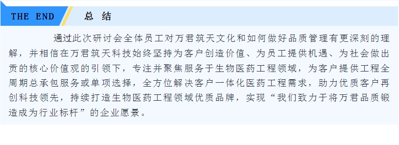 為持續(xù)提升項目管理能力、提高團(tuán)隊?wèi)?zhàn)斗力,進(jìn)而提升公司品質(zhì)管理能力,2023年7月15日,萬君全體員工開展了《工程項目管理能力與品質(zhì)提升》研討會。